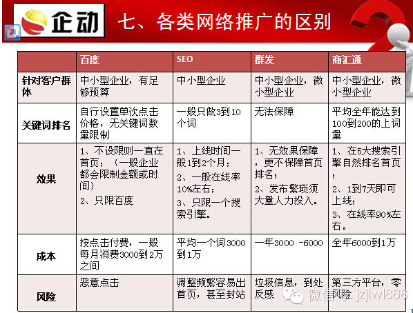 一 .網(wǎng)絡(luò)營銷推廣的現(xiàn)狀? 1、網(wǎng)絡(luò)營銷成為新時代的寵兒!互聯(lián)網(wǎng)的發(fā)展,讓越來越多的人開始重視并選擇網(wǎng)絡(luò)營銷推廣!網(wǎng)絡(luò)營銷大大改變了企業(yè)的營銷方式! 二.企業(yè)網(wǎng)站宣傳推廣新助手-商匯通 "商匯通"是國內(nèi)首家專注于搜索引擎首頁精準營銷的電子商務(wù)云銷平臺,整合企動公司8年技術(shù)積累和優(yōu)秀合作平臺,幫助客戶實現(xiàn)成百上千個精準關(guān)鍵詞自然排名8大搜索引擎首頁,方便、快捷、穩(wěn)定實現(xiàn)企業(yè)搜索引擎推廣。 三.選擇我們的十大理由 1、五大搜索引擎首頁排名推廣! 四.商匯通和百度推廣競價,官網(wǎng)優(yōu)化比較 |