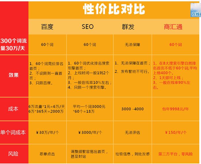 1、網(wǎng)絡(luò)營(yíng)銷(xiāo)成為新時(shí)代的寵兒!互聯(lián)網(wǎng)的發(fā)展,讓越來(lái)越多的人開(kāi)始重視并選擇網(wǎng)絡(luò)營(yíng)銷(xiāo)推廣!網(wǎng)絡(luò)營(yíng)銷(xiāo)大大改變了企業(yè)的營(yíng)銷(xiāo)方式! 二.企業(yè)網(wǎng)站宣傳推廣新助手-商匯通 "商匯通"是國(guó)內(nèi)首家專(zhuān)注于搜索引擎首頁(yè)精準(zhǔn)營(yíng)銷(xiāo)的電子商務(wù)云銷(xiāo)平臺(tái),整合公司8年技術(shù)積累和優(yōu)秀合作平臺(tái),幫助客戶實(shí)現(xiàn)成百上千個(gè)精準(zhǔn)關(guān)鍵詞自然排名8大搜索引擎首頁(yè),方便、快捷、穩(wěn)定實(shí)現(xiàn)企業(yè)搜索引擎推廣。 三.選擇我們的十大理由 1、五大搜索引擎首頁(yè)排名推廣!